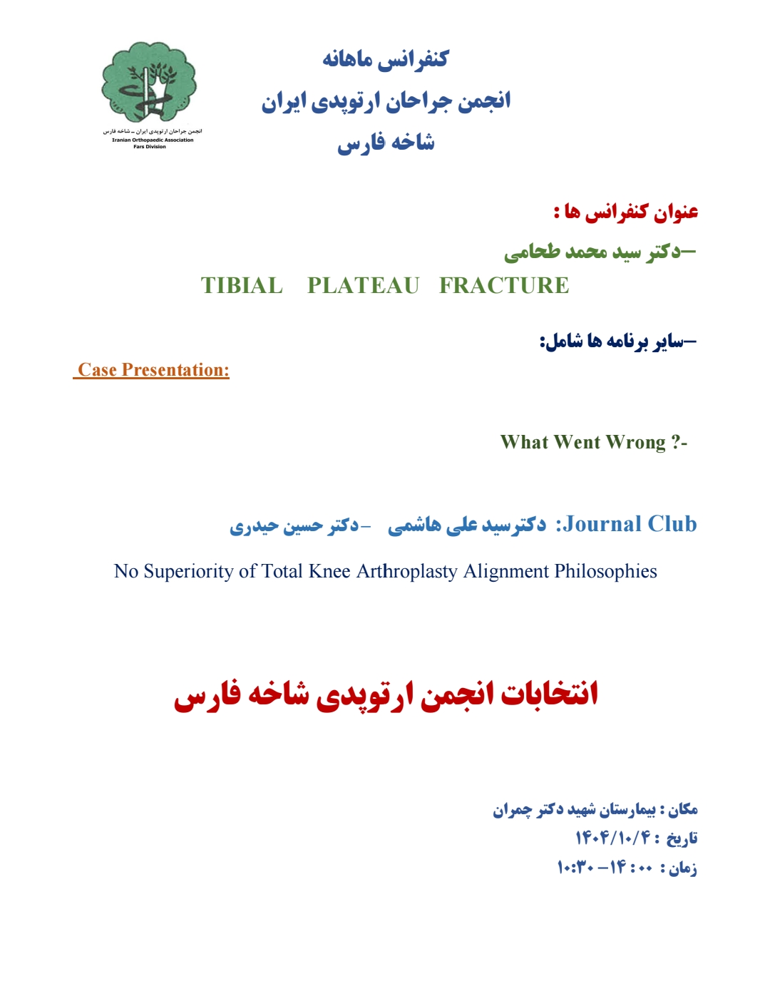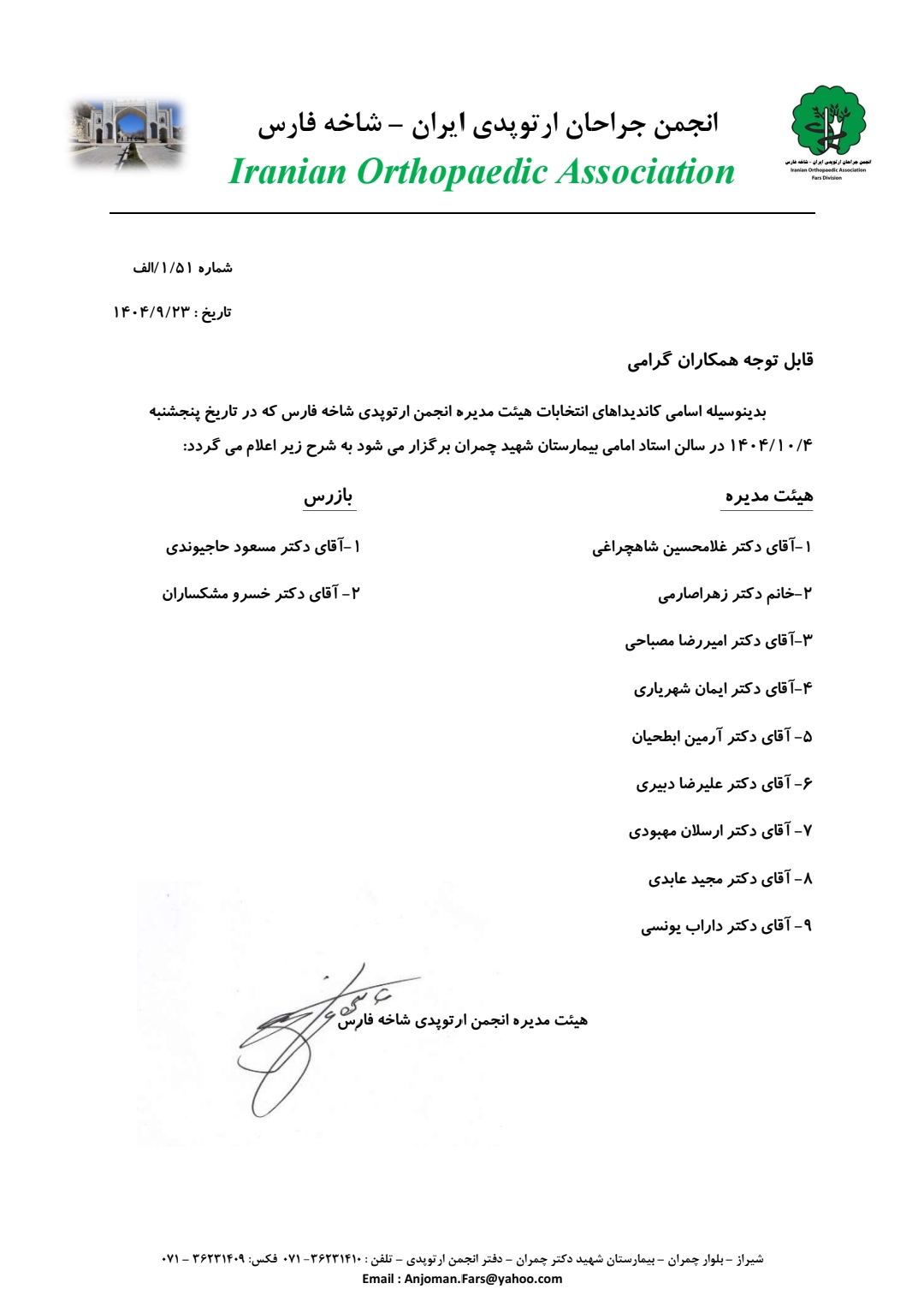 قابل توجه همكاران گرامي بدينوسيله اسامي كانديداهاي انتخابات هيئت مديره انجمن ارتوپدي شاخه فارس كه در تاريخ پنجشنبه /١٠/٤ ١٤٠٤ در سالن استاد امامي بيمارستان شهيد چمران برگزار مي شود به شرح زير اعلام مي گردد: هيئت مديره بازرس -١آقاي دكتر غلامحسين شاهچراغي -١آقاي دكتر مسعود حاجيوندي -٢خانم دكتر زهراصارمي -٢ آقاي خسرودكتر مشكساران -٣آقاي دكتر اميررضا مصباحي -٤آقاي دكتر ايمان شهرياري -٥ آقاي دكتر آرمين ابطحيان -٦ آقاي دكتر عليرضا دبيري -٧ آقاي دكتر ارسلان مهبودي -٨ آقاي دكتر مجيد عابدي -٩ آقاي دكتر داراب يونسي